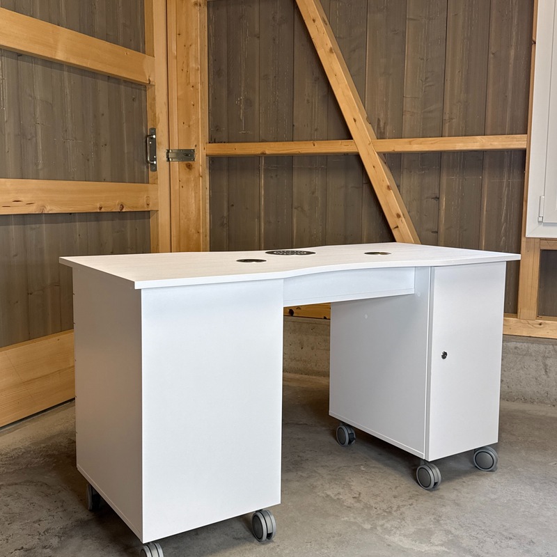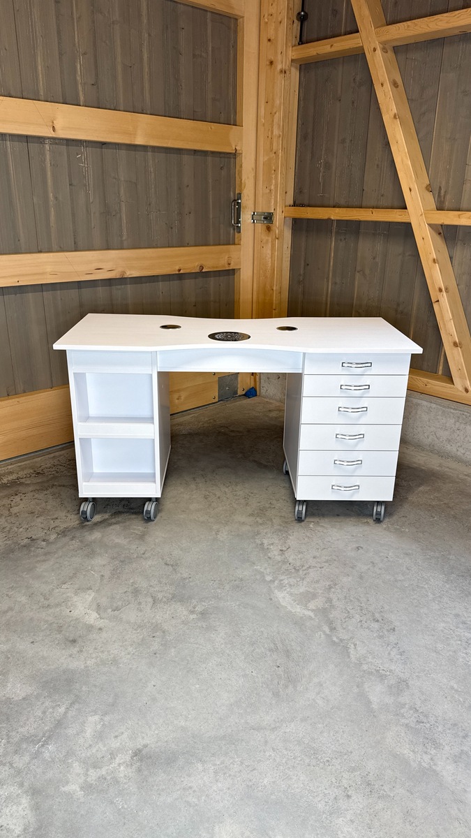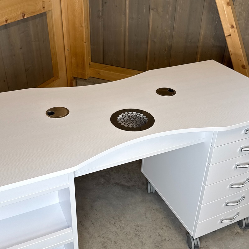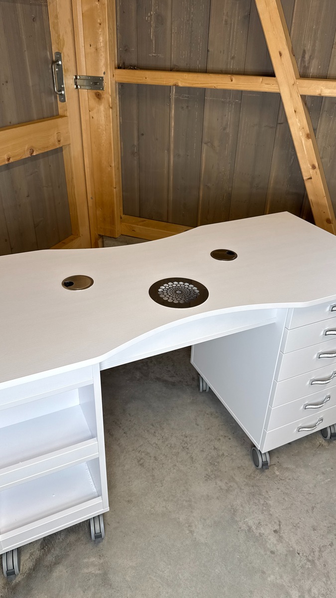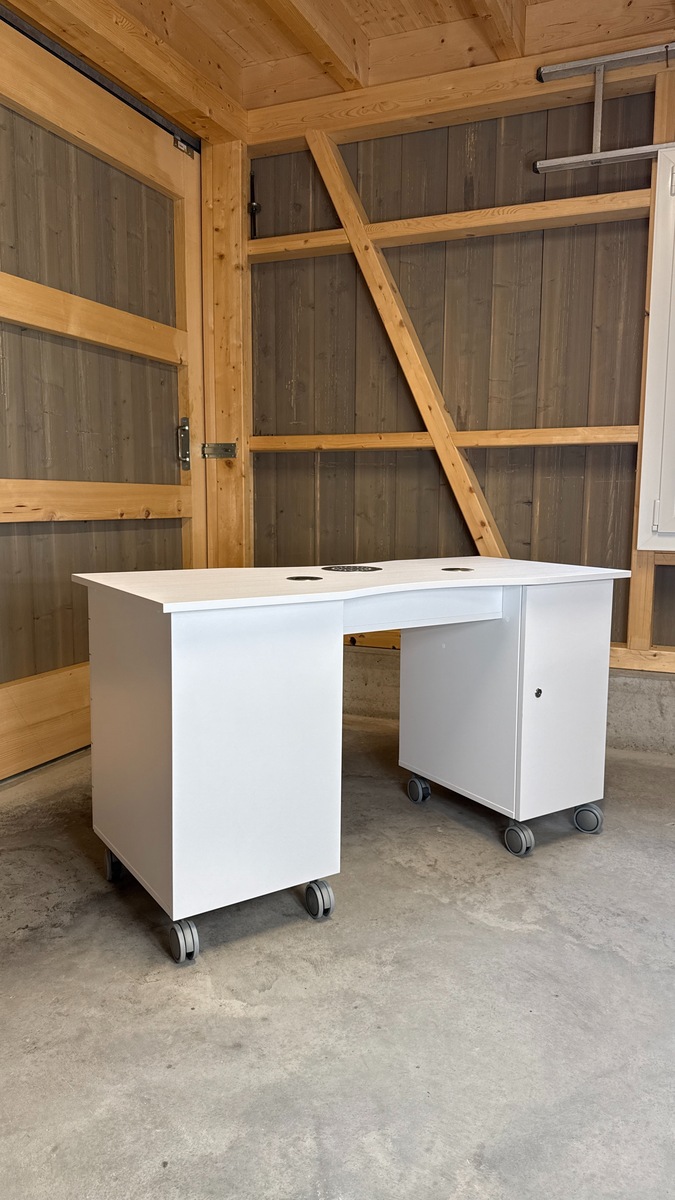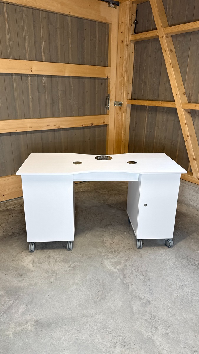 Das Absaugsystem des Tisches befindet sich auf der C-Seite. Der Kabelausgang ist ebenfalls auf dieser Seite angebracht. Auf der B-Seite befindet sich der Absaugmotor und der Filter, auf der gegenüberliegenden A-Seite ist ein 2-teiliges Stauregal integriert.