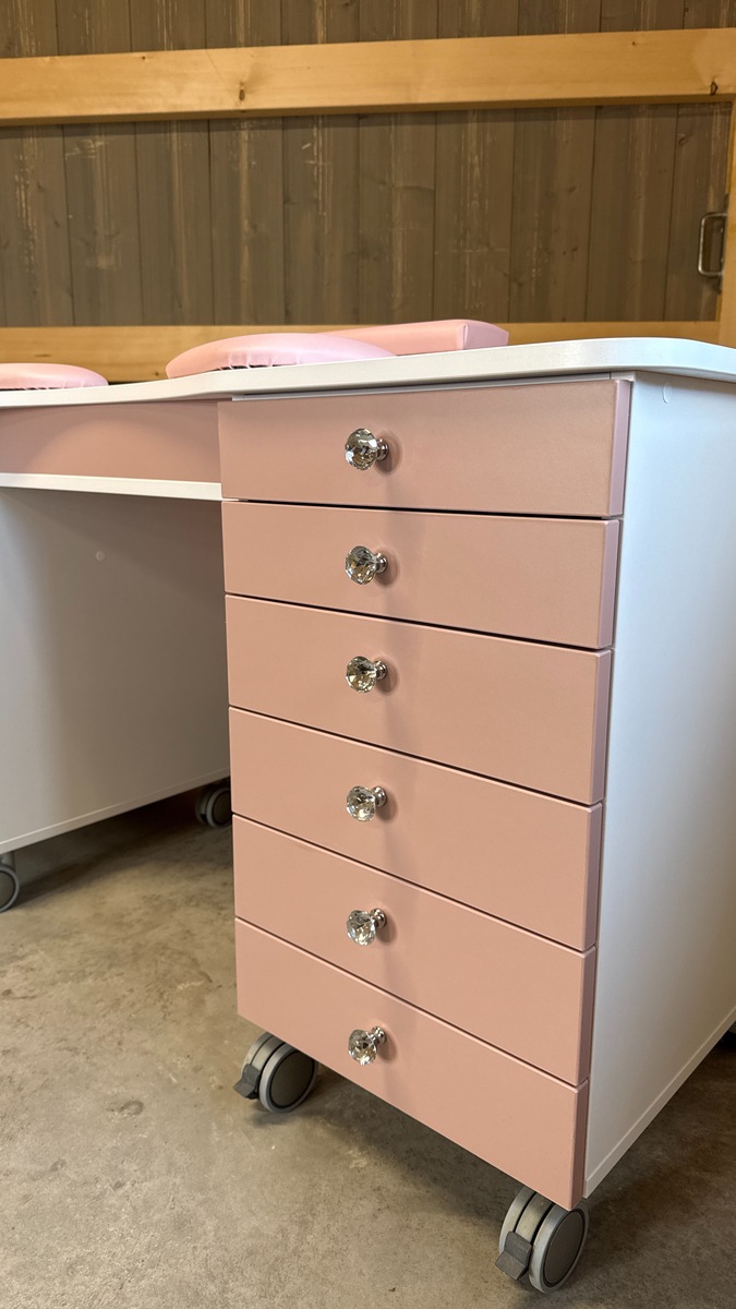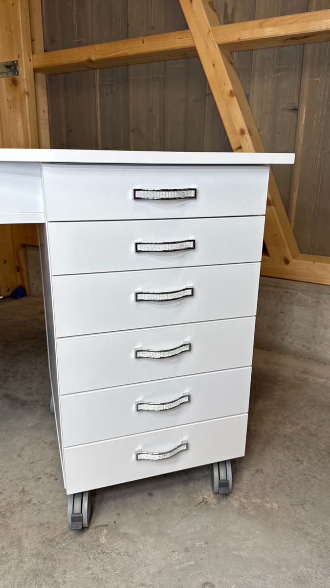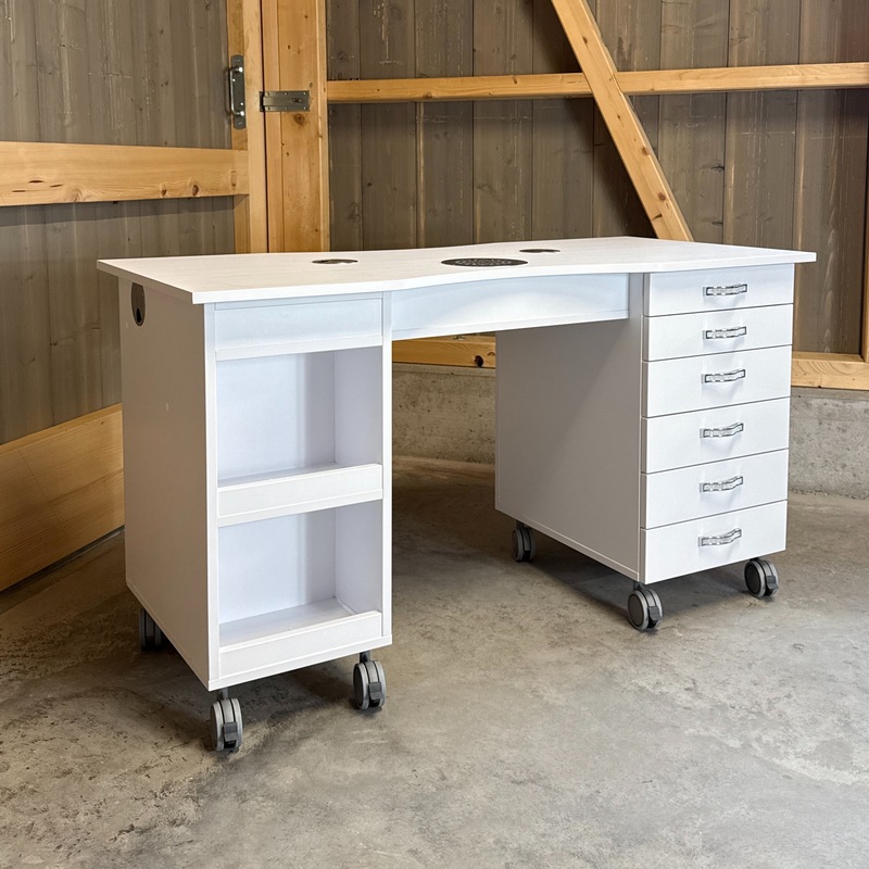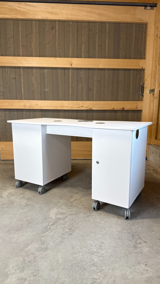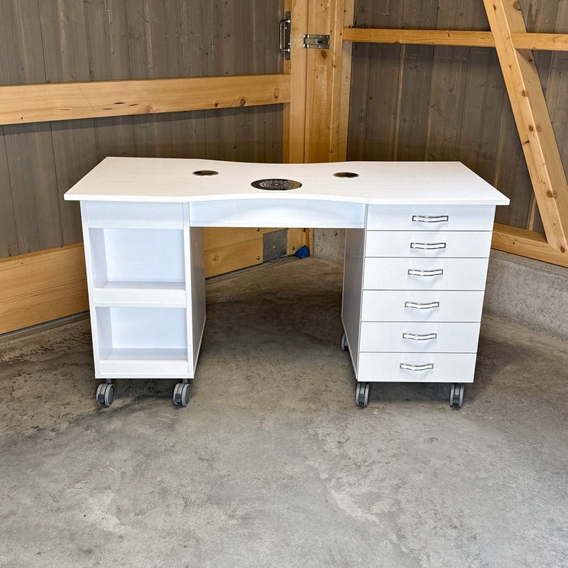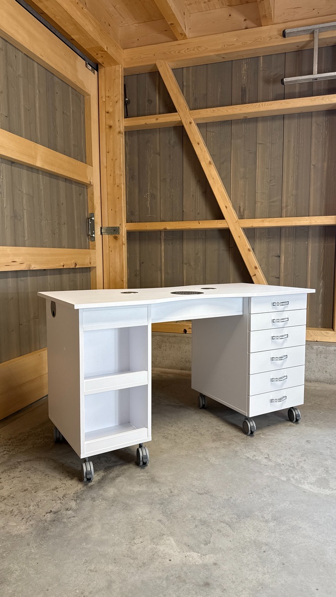 Das Absaugsystem des Tisches befindet sich auf der C-Seite. Der Kabelausgang ist ebenfalls auf dieser Seite angebracht. Auf der B-Seite befindet sich der Absaugmotor und der Filter, auf der gegenüberliegenden A-Seite ist ein 2-teiliges Stauregal integriert.