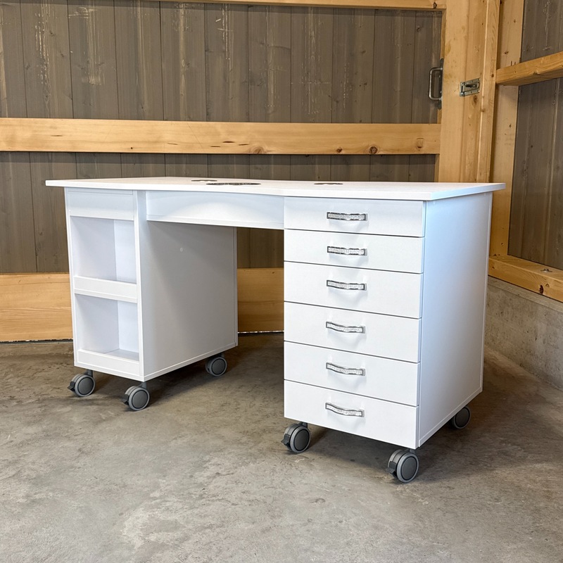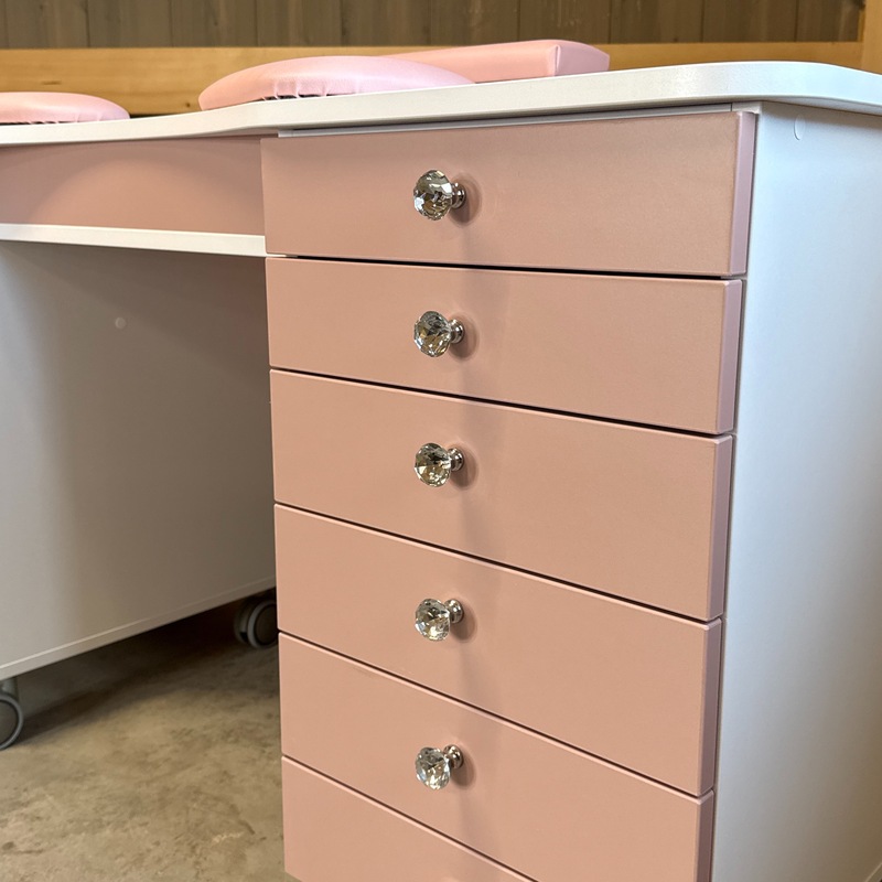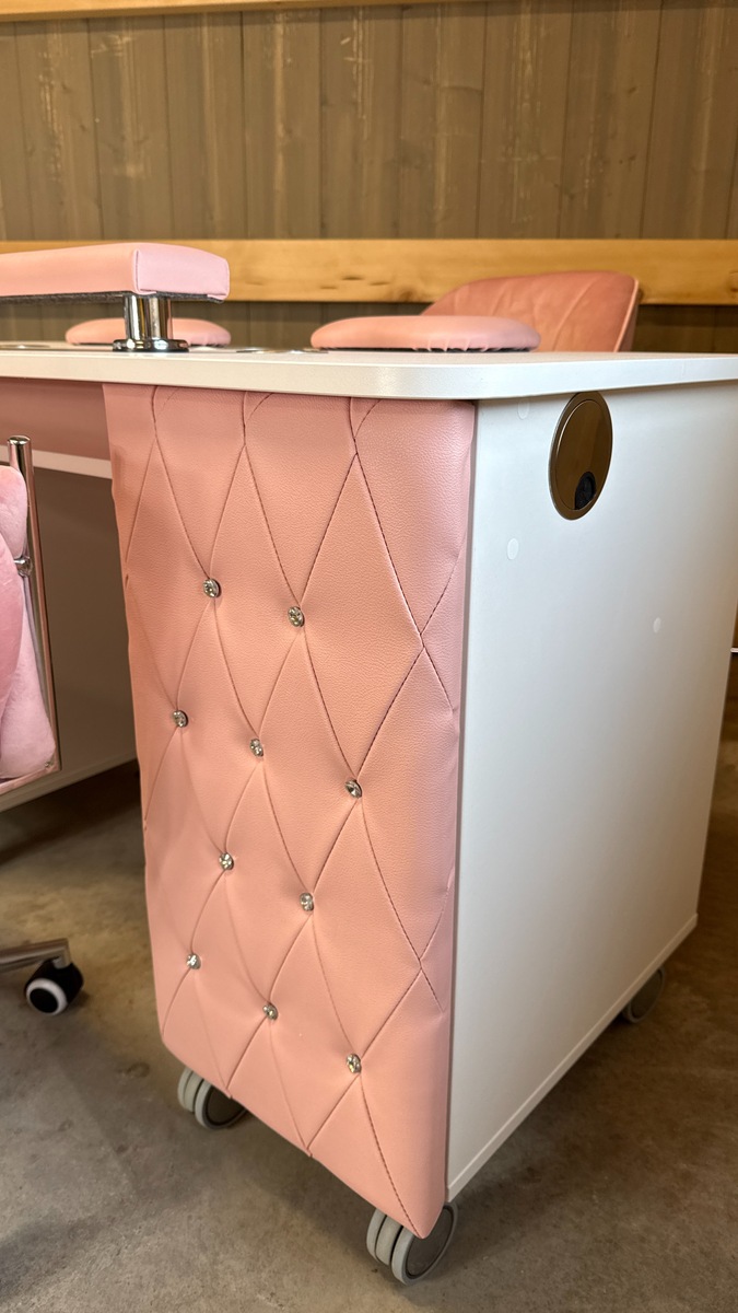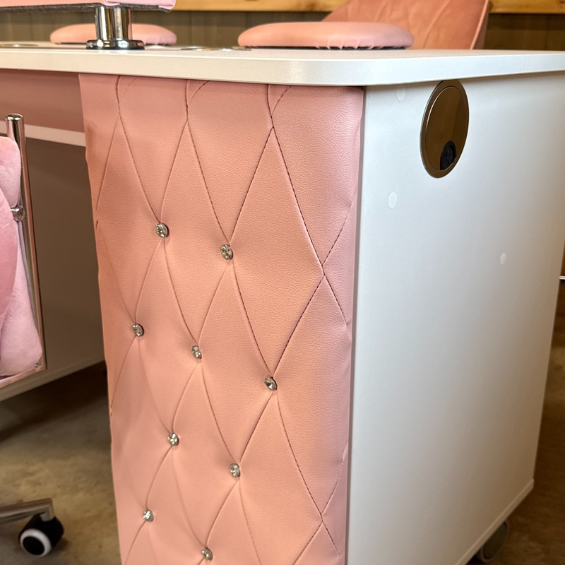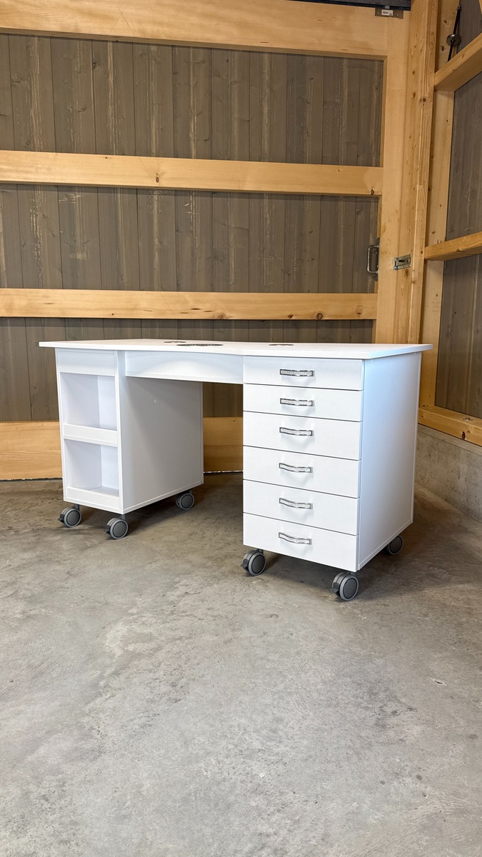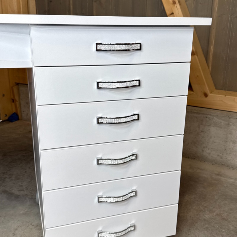 Das Absaugsystem des Tisches befindet sich auf der C-Seite. Der Kabelausgang ist ebenfalls auf dieser Seite angebracht. Auf der B-Seite befindet sich der Absaugmotor und der Filter, auf der gegenüberliegenden A-Seite ist ein 2-teiliges Stauregal integriert.